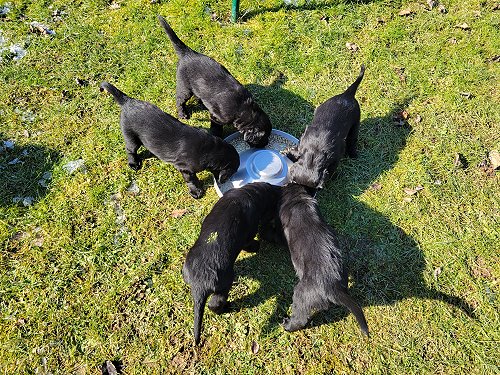 Die Welpen werden nun meist in einem Ringnapf gefüttert. Das Picknick im Garten bestand diesmal aus eingeweichtem Welpentrockenfutter mit etwas Ziegenmilch. Die Puppies wären keine Flatcoated Retriever, wenn auch nur ein Bröckchen übrig bliebe. Nach dem Picknick wird die Umgegend erkundet. Zunächst wird gemeinsam ein bewachsener Hügel vorsichtig in Augenschein genommen. Dabei machen die Welpen auch Bekanntschaft mit den Schneeresten im Schatten. Ein Baby trainiert schon mal den Gassenslalom. Sehr fleißig, unsere Nachwuchshoffnung!