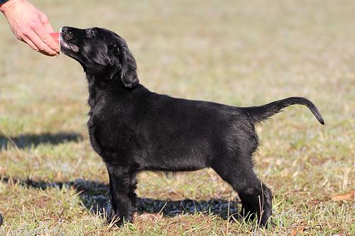 56 cm Kleine Hündin mit vorzüglichem Kopf, viel feminine Ausstrahlung, mittelbraune Augen + vorzüglich getragener Behang, vorzügliches Gebäude, korrekt in allen Teilen, Bewegung vorne etwas lose in den Ellbogen, hinten etwas eng.