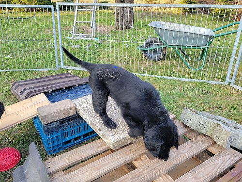 Zunächst wurde der Klettergarten mit unseren erwachsenen Hündinnen gemeinsam begutachtet, aber schnell wollten die kleinen Racker das neue Gelände erkunden. Im Ballbad können die Puppies wild herumtoben oder aber auch ein ganz entspanntes Ballbad nehmen..