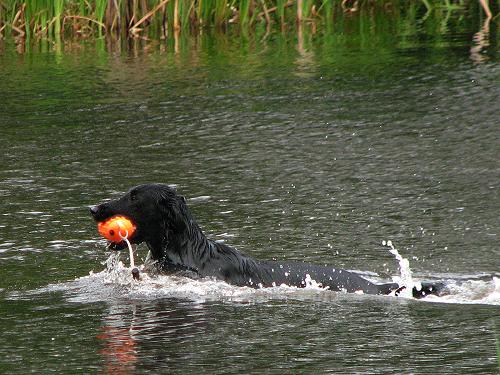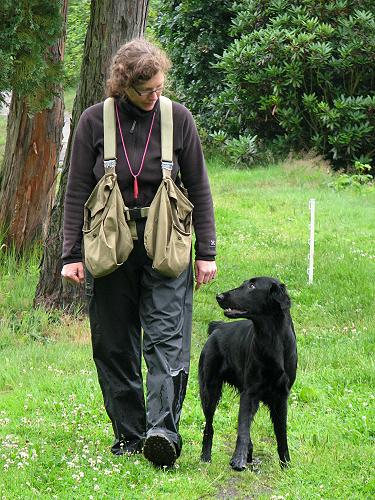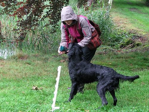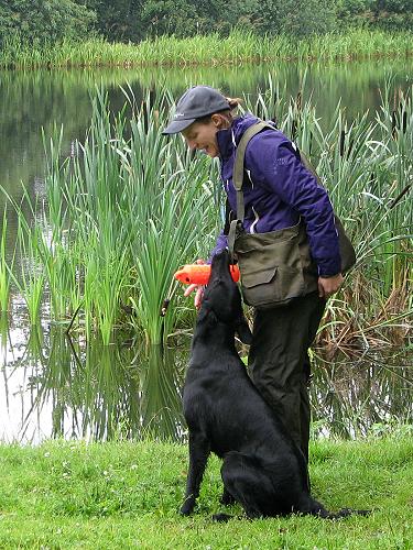 mit Carsten Schröder Seite 1 An dem Wochenende des 14. und 15. Juli 2012 haben wir ein Dummy-Seminar mit dem Schwerpunkt auf der Wasserarbeit organisiert. Das Seminar sollte zum einen unsere G-chen in der “Anfängergruppe” bei der Wasserarbeit voranbringen. Diese Gruppe bestand aus WW Gladsome Phelan, WW Gentle Embrace, WW Glimta Till Wilma und unserer Pleasure (WW Great Pleasure). Nach dem ersten Vormittag bereits sahen die Hundeführer so aus, als ob auch sie die Dummys aus dem Wasser hatten holen müssen. Es regnete teilweise in Strömen, damit war also vollkommen gleichgültig, ob sich direkt neben einem der Hund schüttelte oder nicht. Geübt wurde die Fussarbeit am Wasser, das saubere Abgeben der Dummys, Apport aus dem Wasser mit verschiedenen Einstiegen und die Arbeit im Schilf. WW Gladsome Phelan und Julia